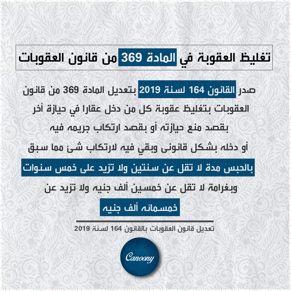 – تعديل قانون العقوبات المصري بالقانون 164 لسنة 2019 في المادة (369).