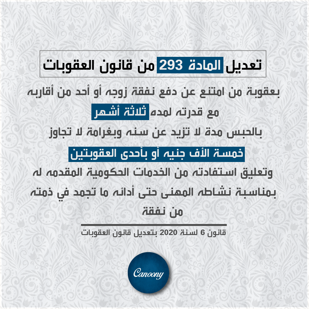 – يعاقب كل من صدر عليه حكم نهائي واجب النفاذ بدفع نفقة لزوجه أو احد من أقاربه أو اجرة حضانه أو رضاعه أو مسكن وامتنع عن الدفع مع قدرته لمدة ثلاثة أشهر بعد التنبيه عليه بالدفع, بالحبس لمدة لا تزيد عن سنه وبغرامة لا تتجاوز خمسه الأف جنيه أو بإحدى العقوبتين, بالاضافة إلى تعليق استفادته من الخدمات الحكومية المقدمة بمناسبة ممارسته لنشاطه المهنى حتى ادائة لما تجمد في ذمته لصالح المحكوم له.