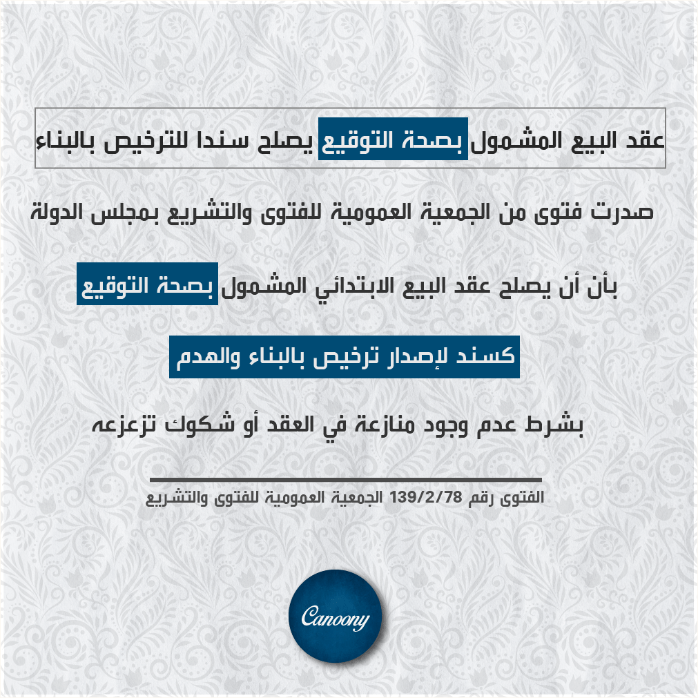 صدرت الفتوى أن يصلح عقد البيع الابتدائي المشمول بصحة التوقيع سند لإصدار ترخيص البناء والهدم ما دام أنه ليس سمة منازعة في العقد أو شكوك تزعزع الثقة فيه.