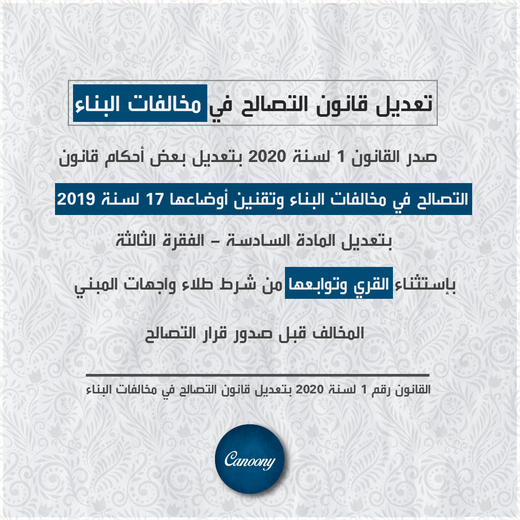 حيث عدل القانون الجديد من المادة السادسة – الفقرة الثالثة من قانون التصالح في مخالفات البناء رقم 17 لسنة 2019 بإستثناء القري وتوابعها من شرط طلاء واجهات المبنى المخالف لصدور قرار التصالح.