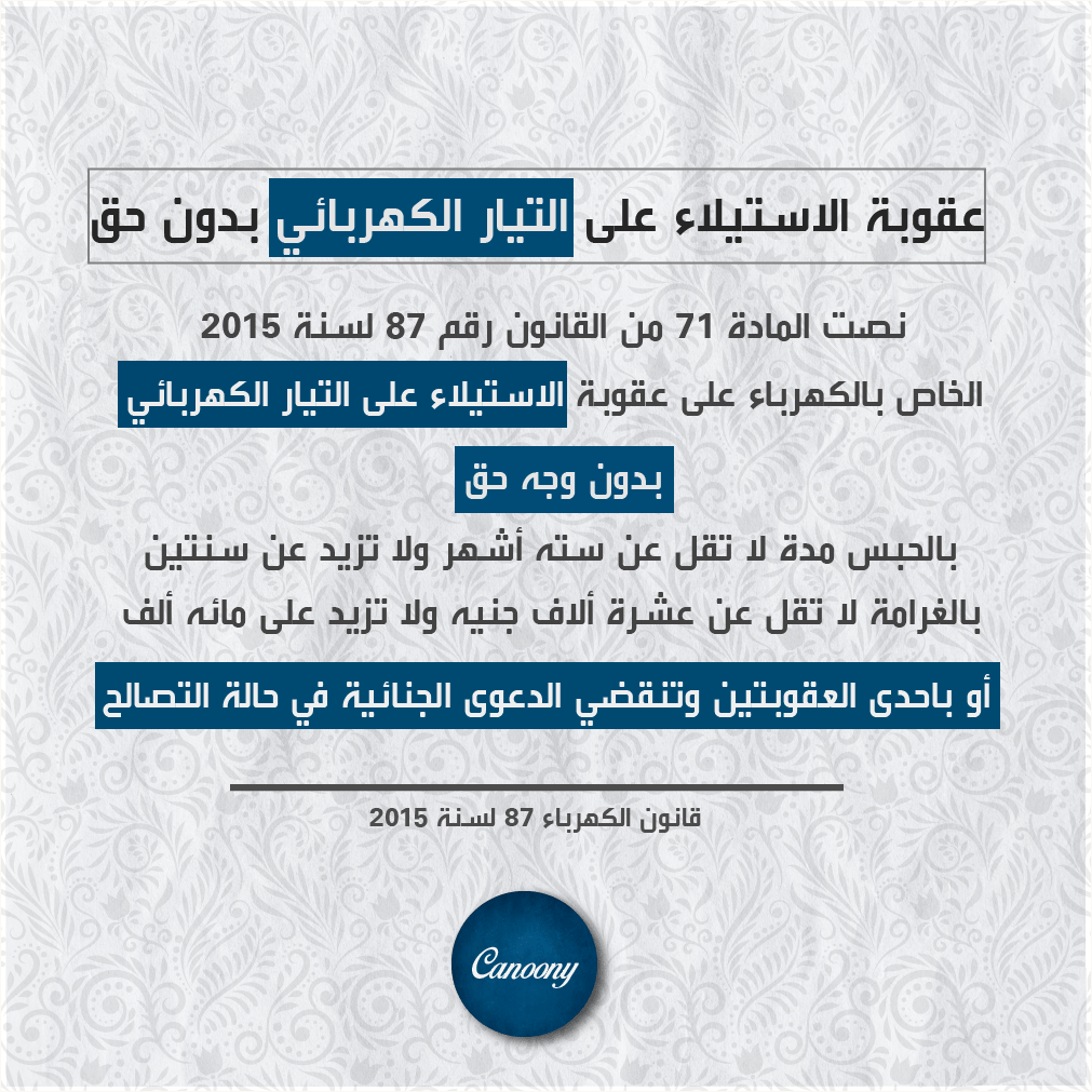– نصت المادة (71) من قانون الكهرباء 87 لسنة 2015 على عقوبة الاستيلاء على التيار الكهربائي.